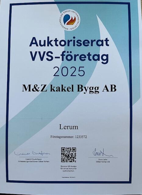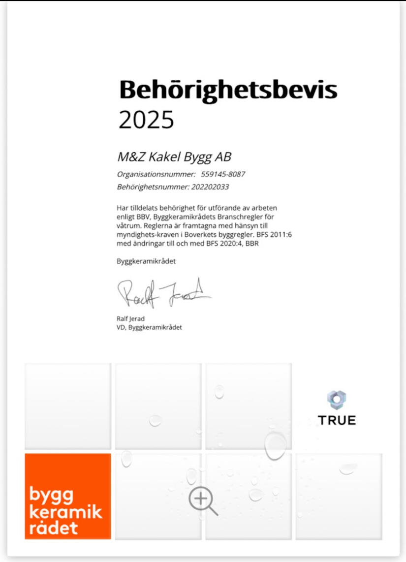 M&Z Kakel Bygg AB är behörigt våtrum enligt BKR. Vi är även behöriga att uträtta elarbeten upp till 1 000 V och kan tillhandahålla certifierade rörläggare. Med ett medlemskap i Villaägaren, innehavande av heltäckande försäkring hos Länsförsäkringar Älvsborg samt fackmässigt utförda jobb kan vi erbjuda kvalitetssäkrade och prisvärda helhetslösningar för företag, privatpersoner och kommuner i hela Västra Götalandsregionen.